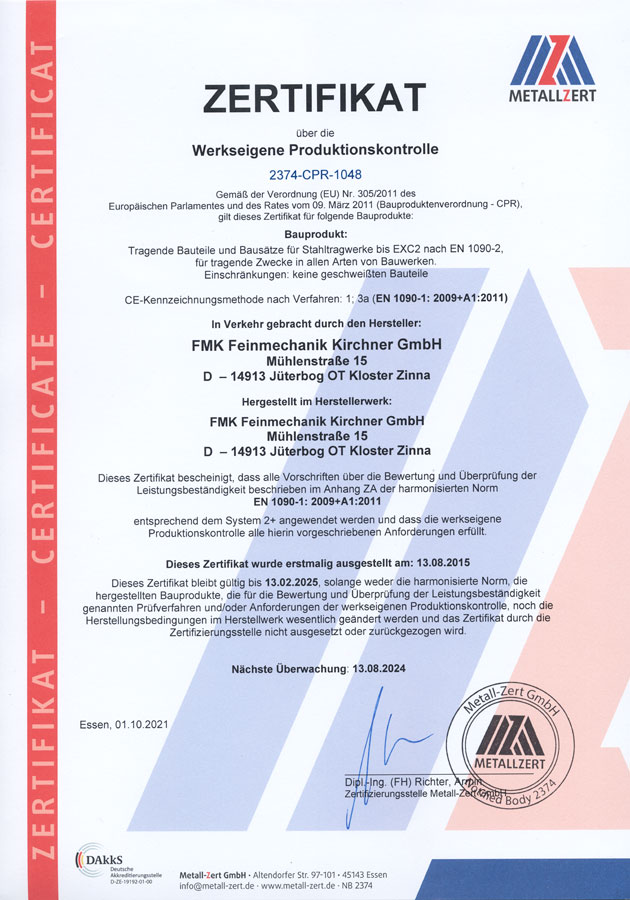 Die FMK Feinmechanik Kirchner GmbH ist seit August 2015 nach EN 1090-1 + EN 1090-2 durch die Metall-Zert GmbH zertifiziert. Die Zerifizierung wurde zuletzt 2018 und 2021 erneuert.